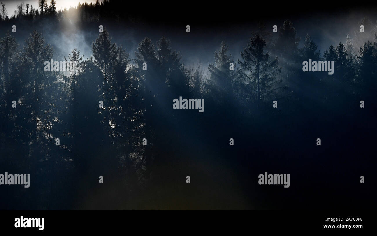 Garmisch Partenkirchen Germany 01st Nov 2019 The Morning Sun Comes Out Behind Dark Treetops And Shines Through Rising Wafts Of Mist Credit Angelika Warmuth Dpa Alamy Live News Stock Photo Alamy